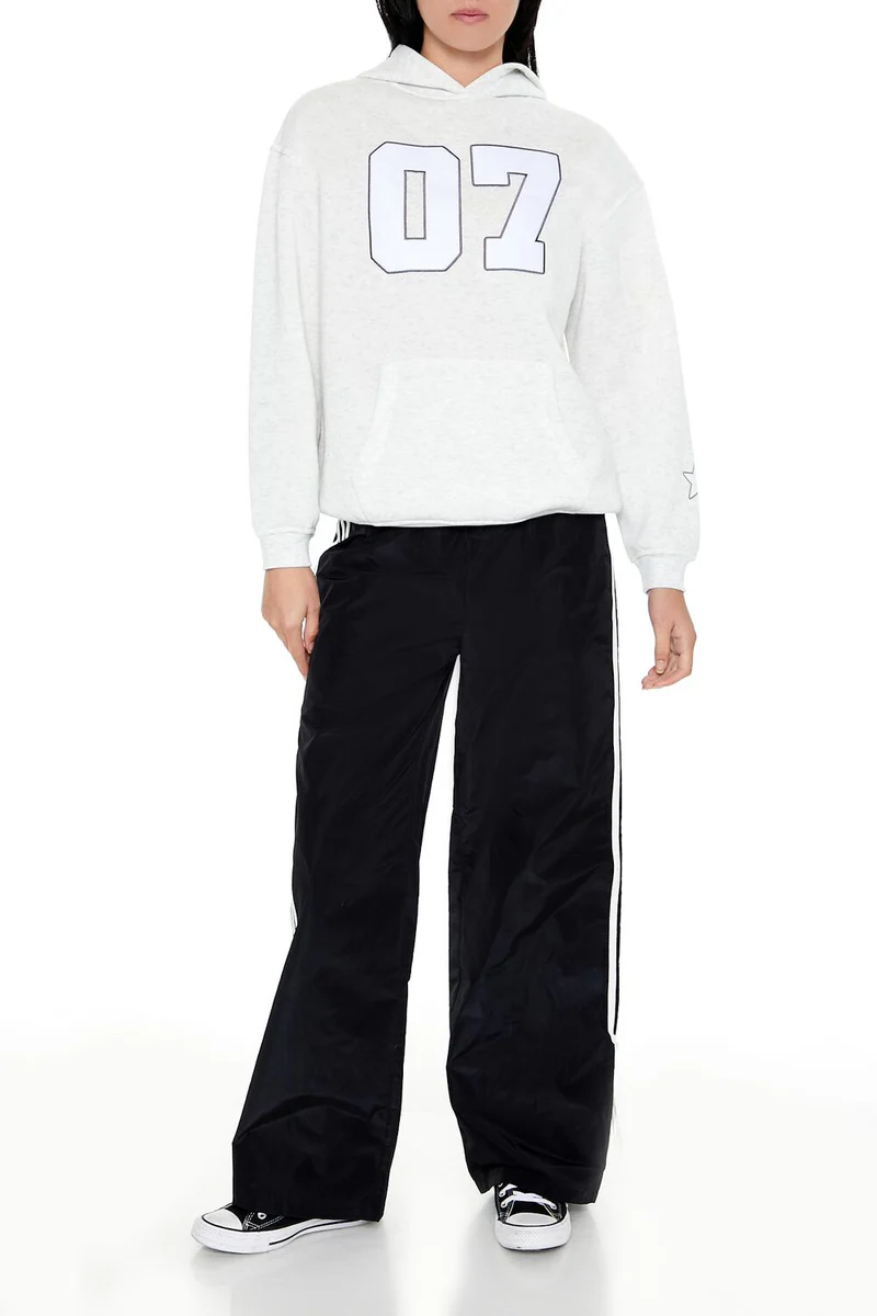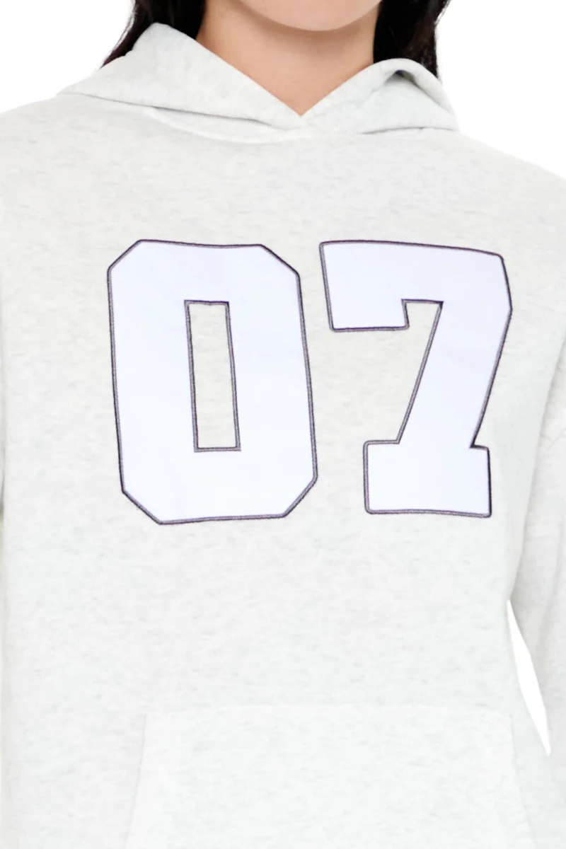 A fleece hoodie featuring dropped long sleeves, front ’07’ text, front kangaroo pocket, and ribbed trim.