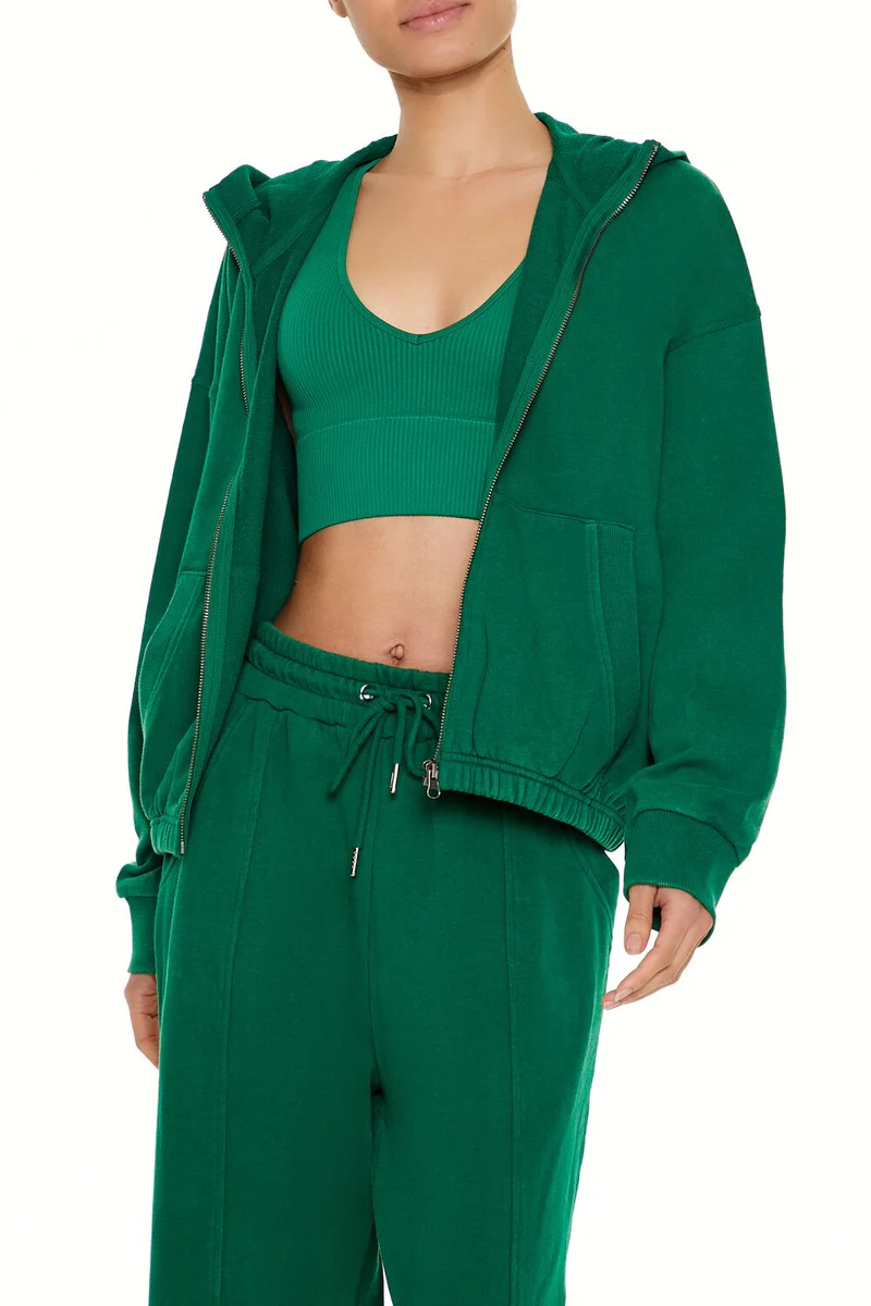 An athletic French terry zip-up hoodie featuring ribbed trim, a split kangaroo front pocket, dropped long sleeves, and elasticized waist.- Matching bottoms available. Complete the look with 01371595 or 01371596.
