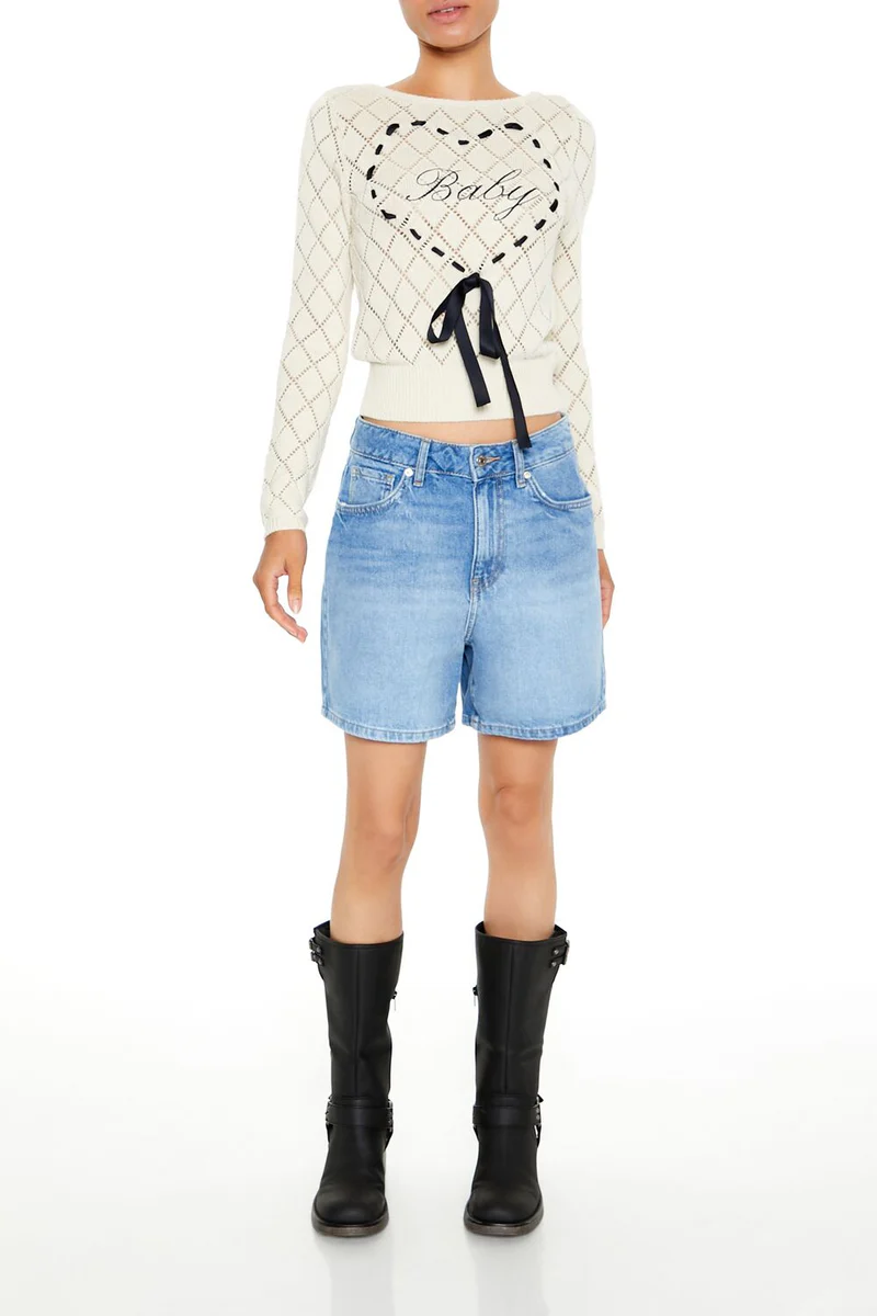 A Pointelle knit sweater featuring front ‘Baby’ text, ribbon-stitched heart design with a bow embellishment, ribbed trim, long sleeves, and a boat neckline.