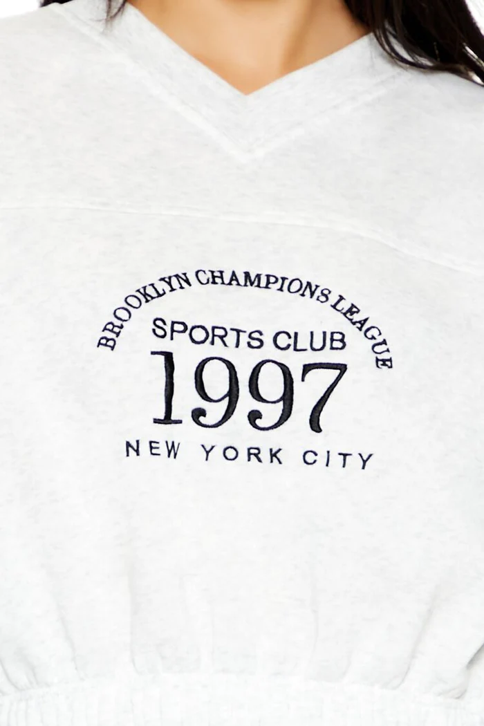 A fleece pullover featuring front ‘Brooklyn Champions League’, ‘Sports Lodge’, ‘1997’, and ‘New York City’ embroidery, a V-neckline, long sleeves with varsity-striped trim, cropped silhouette, and elasticized hem.