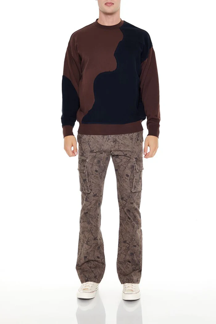 A knit pullover sweatshirt featuring raw-cut trim, an allover colorblock design, crew neck, and dropped long sleeves.