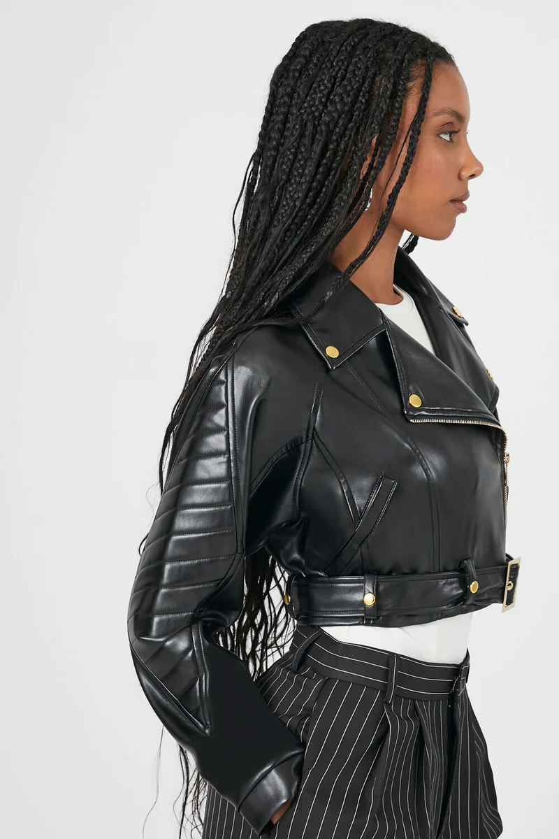 A faux leather moto jacket featuring notched lapels, zip-up front closure, high-polish hardware, slanted front pockets, long sleeves, and belted cropped hem.