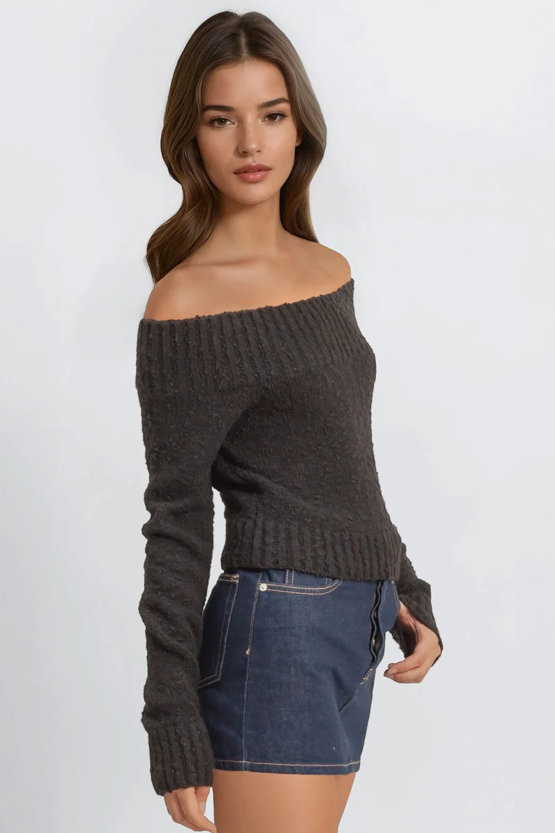 Knit sweater featuring an off-the-shoulder neckline