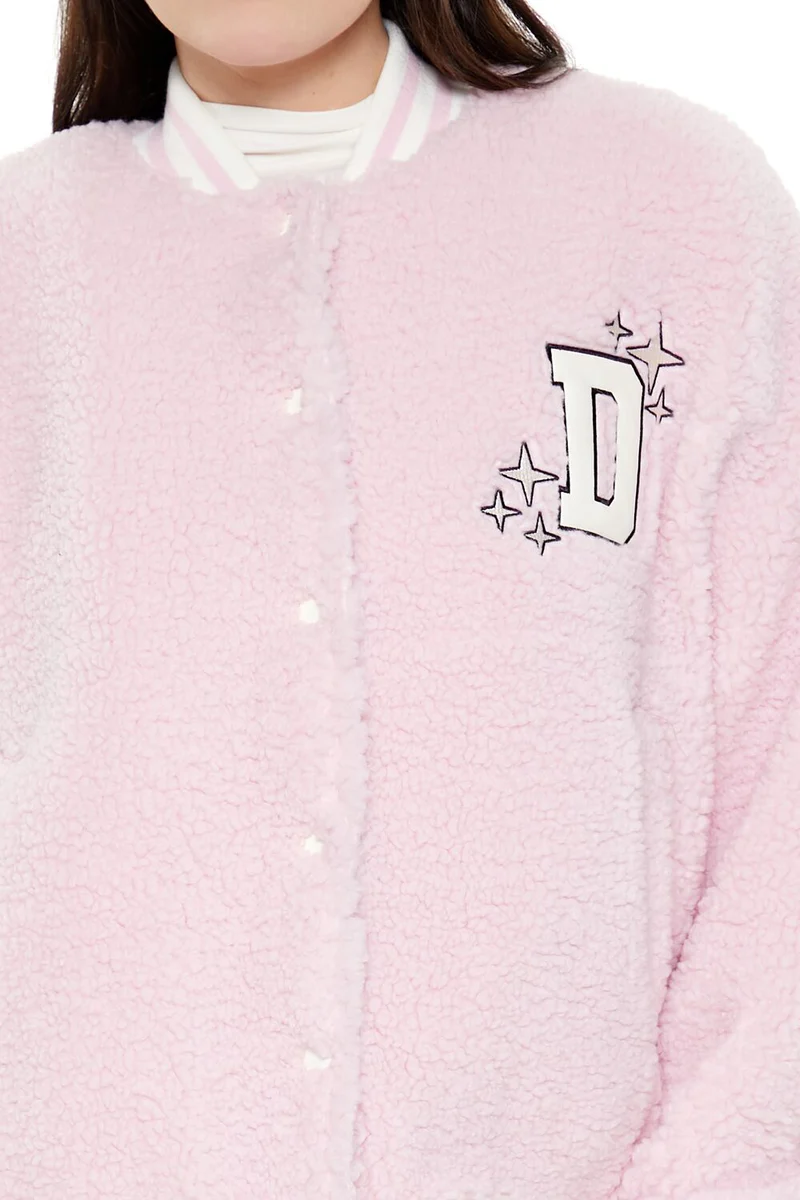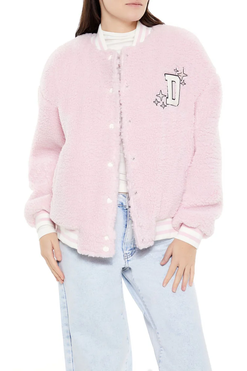 A faux shearling bomber jacket featuring varsity-striped trim, a flat collar, snap button-front closures, chest letter ‘D’ text and star graphic patches, slanted front pockets, dropped long sleeves, and back ‘Delusional’ and ’03’ text patches.