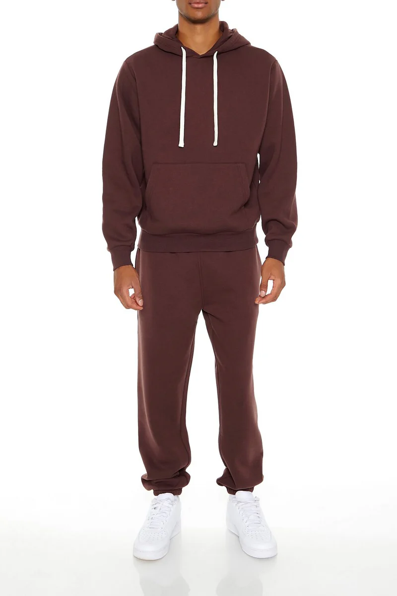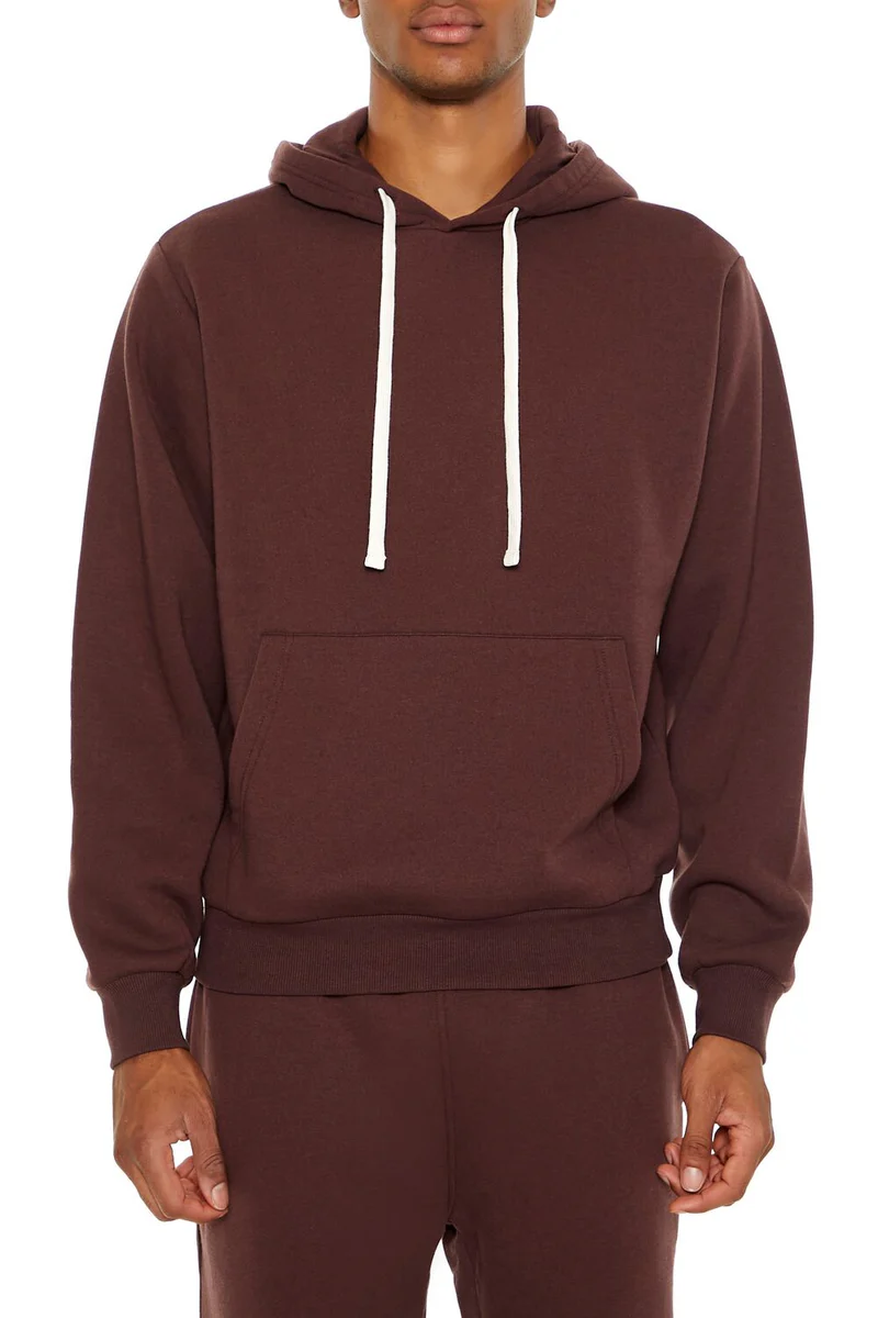 A cotton-blend knit hoodie featuring contrasting drawstrings at the hood, front kangaroo pocket, long sleeves, and ribbed trim.