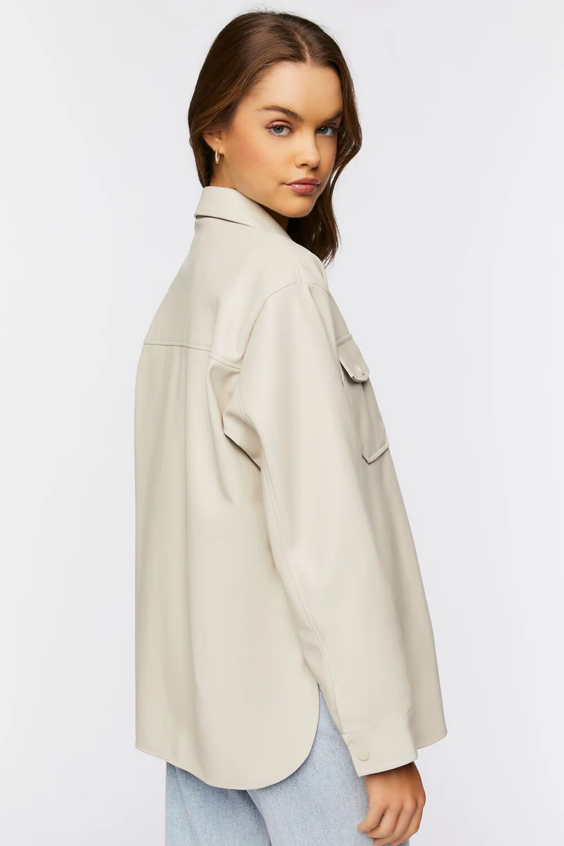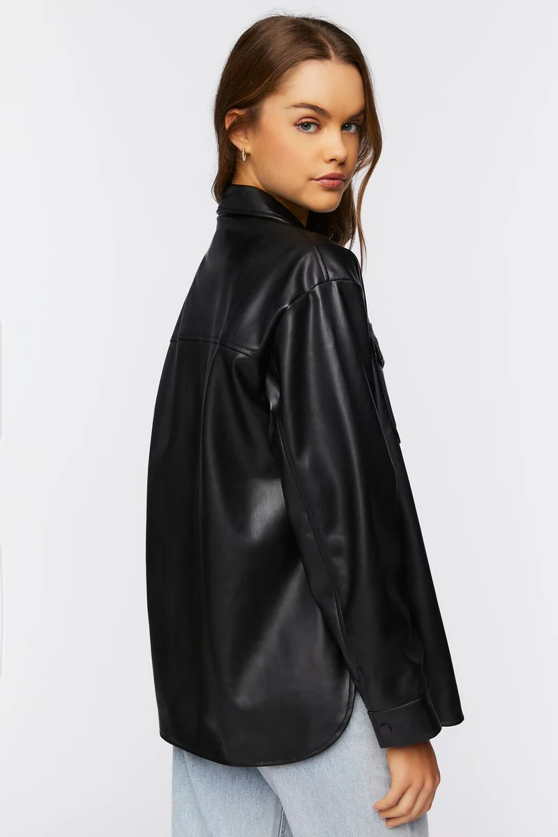 A faux leather shacket featuring a basic collar, snap-button closures on the chest flap pockets and front, dropped long sleeves, and a dolphin hem.