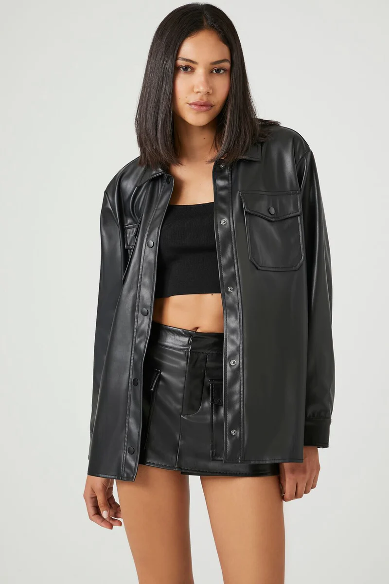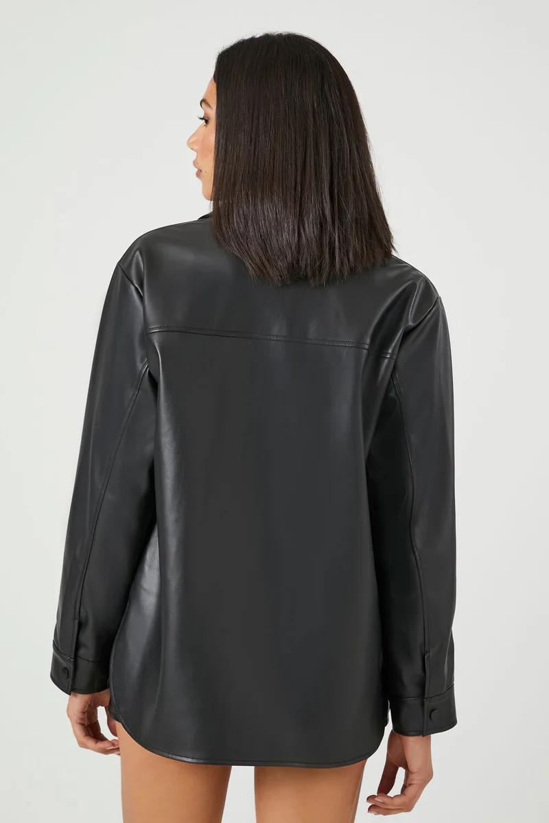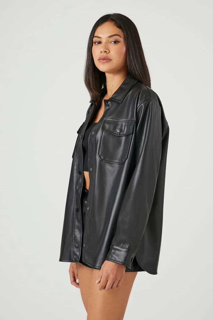 A faux leather shacket featuring snap-button front closures, long sleeves, chest flap pockets, a basic collar, and vented hem.