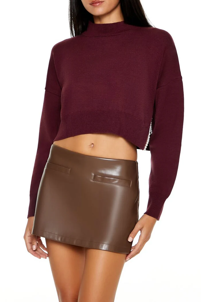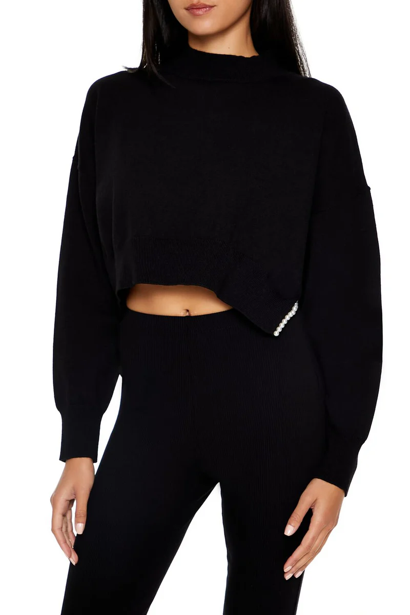 A knit sweater featuring ribbed trim, a mock neck, dropped long sleeves, vented cropped hem, and faux pearl trim.