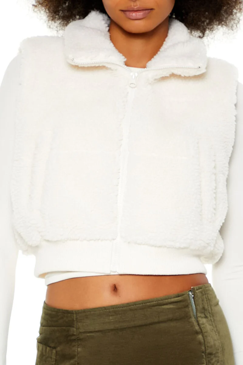 A faux shearling vest featuring ribbed trim, a funnel neck, zip-up front closure, split kangaroo front pocket, and cropped hem.