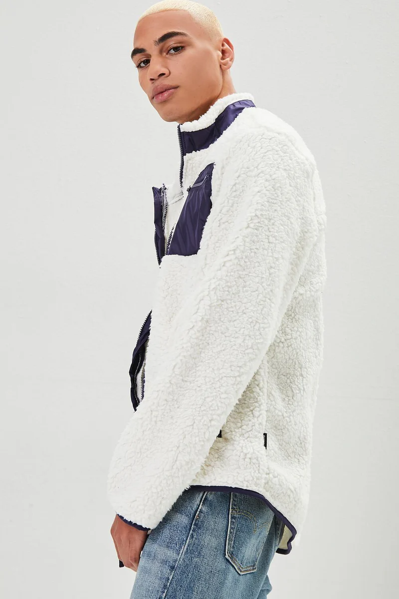A faux shearling jacket featuring a colorblock design, funnel neck, zippered closure on the slanted front and chest pockets, a scoop hem, and zip-up front.