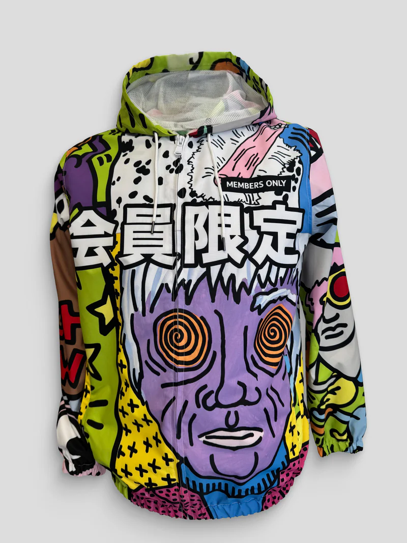 Make a bold statement with this limited-edition Members Only hoodie featuring iconic artwork from legendary pop artist Keith Haring. The back showcases a vibrant, graffiti-inspired character face with expressive eyes and a stylized mouth, framed by Haring’s signature linework and abstract shapes. “K. Haring” is printed above in crisp white, while “Members Only” appears below in elegant cursive script. Finished with a branded hood label and a kaleidoscope of colors, this hoodie blends streetwear edge with artistic legacy.