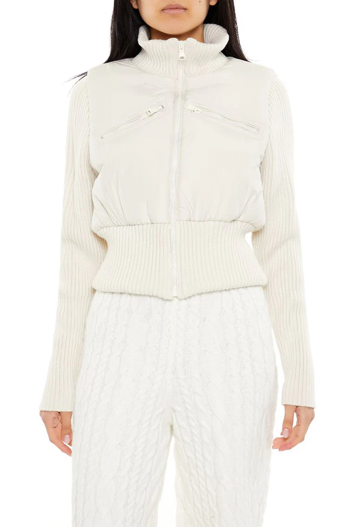 A mixed media jacket featuring partial ribbed trim, funnel neck, zip-up front closure, long sleeves, and zipper chest pockets.