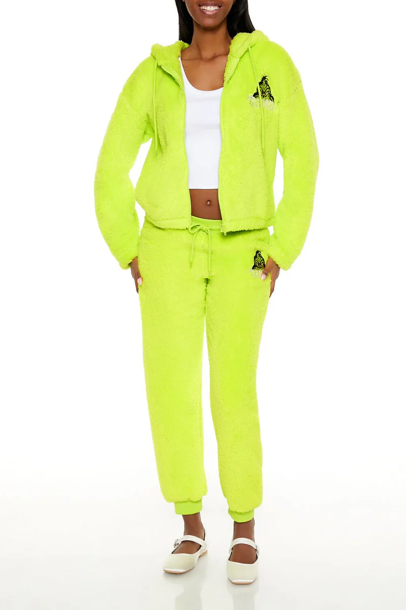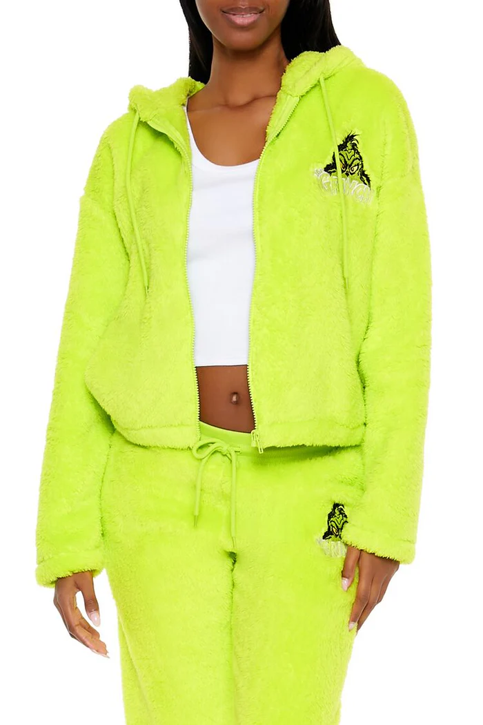 A plush zip-up hoodie featuring a drawstring hood, ‘The Grinch’ and character embroidery, and long sleeves.- Officially licensed product