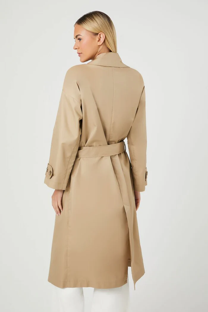 A twill trench coat featuring peak lapels, an open front, long sleeves with buttoned cuffs, belt loops with removable self-tie belt, and split back hem.